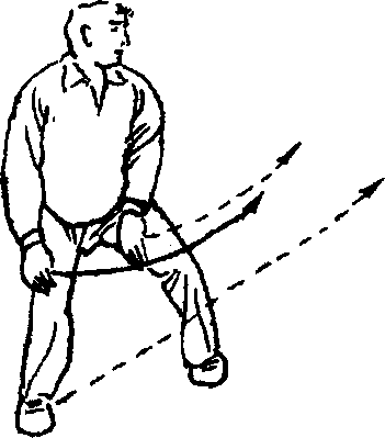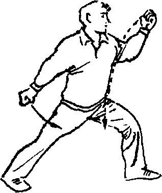 双脚以前掌为轴碾地,身体右后转,左脚向前一步,左腿 屈膝,右腿伸直。双掌变拳,左拳随左脚前迈由身后向下、向