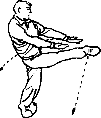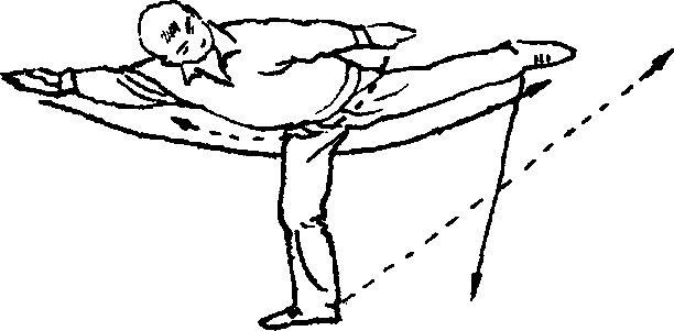 ②上动不停,左脚直腿向后撩踢,上身前伏,左掌直臂向 下、向后弧形随腿甩撩,掌心朝右,右掌直臂向下、向前弧形