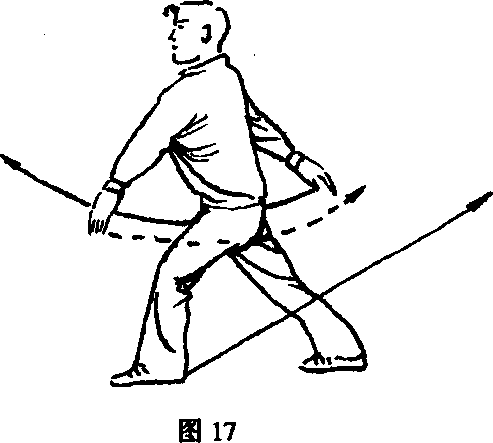 ①右脚落地,身体左后转,双腿微屈膝。随转身,左掌摆 至身体左前方,右掌落向身体右后方(图17)。