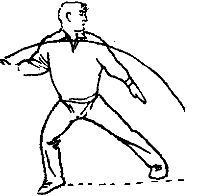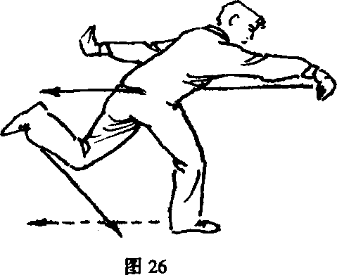 身后,脚掌朝上。双掌变勾手,右勾手用勾顶向前撞击,臂伸 直,勾顶朝前;左勾手从身前经身左侧向身后勾挂,勾尖朝 上。目视前勾手(图26)。