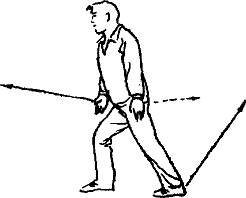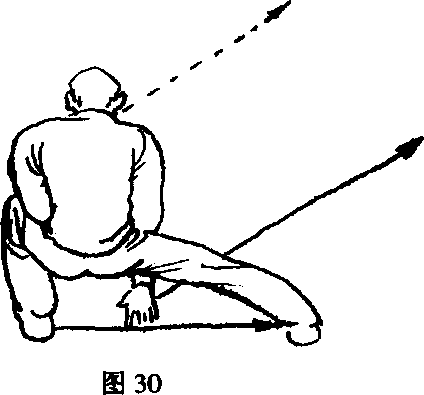 ②右腿站直,上身向前下伏,左脚向后猛力蹬踹,腿伸 直,脚离地,脚尖朝下,力在脚跟。与此同时,右掌用掌指直 臂向前戳击,掌心朝左,左掌用掌指直臂向后戳击,掌心朝 右。目视右脚(图28)。