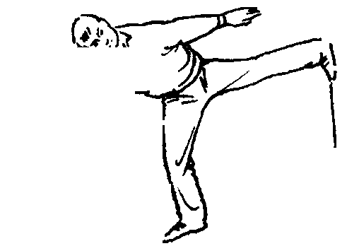 双脚同时向前跳步落地,右腿微屈膝,左脚腿屈膝上抬向