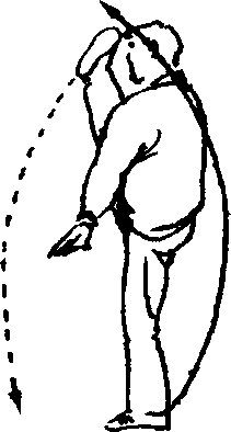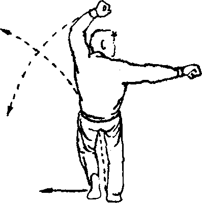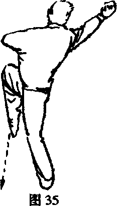 左腿站直,右脚屈膝上提向身前,脚尖朝下。双掌变拳,右拳 直臂反背从身前向上、向后、向下弧形砸击,拳心朝上,左拳平放 右腋前,拳心朝下。上身右转后倾。目视后上方(图35)。