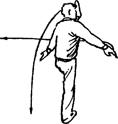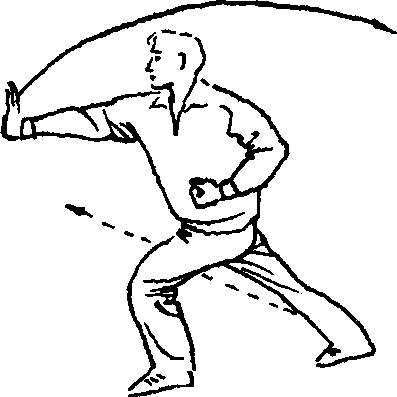 右脚落地,脚尖左摆,身体左后转,左脚直胭向上、向头 左前方外摆腿。目视左脚(图33)。