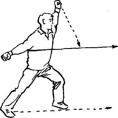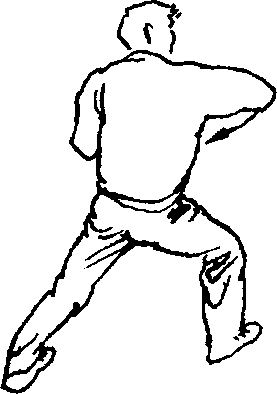 ①左脚落地,右脚随即向右落地(图143)。②身体右转,左脚向前一步落地,左腿屈膝,右腿伸直。 双掌变拳,屈肘收向两肩前后,左前右后同时向身两侧直击, 拳眼朝上。目视左拳(图144)。61 .上步进肘①左拳屈肘向上横架于头前上方,拳心朝前(图145)。②上动不停,右脚向前一步,上身左转,右腿屈膝,左腿 伸直。在右脚上前的同时,右拳屈肘用肘尖向前顶击,左拳变 掌下落向身前抱右拳上。目视右肘(图146)。