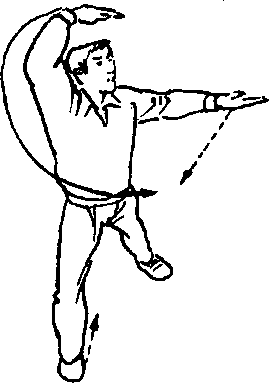 上动不停,身体左转,右脚向前一步落地,双腿右屈左直成 右弓步。左掌向左、向下直臂降落至同肩平,掌心朝上;右掌屈肘 向上横于头上方,掌心朝下,掌指朝左。目视左方(图45)。