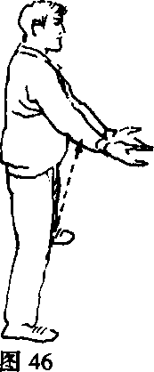 ①身起并左转,右脚向左半步,两腿站直。右掌向后、向 左、向前弧形摆动至身前翻掌,掌心朝前,左掌下落至身前, 用腰、肩推动臂掌左右抖动三次。目随双掌(图46)。