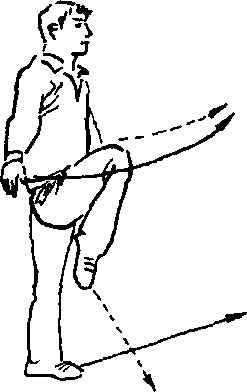 ②双掌臂外旋屈肘上摆向两腋前,用掌背向身体两侧惮 击,掌心朝下。右脚与婵手同时屈膝上提向身前,脚尖朝下。 目视前方(图47)。