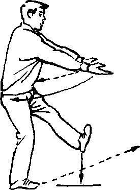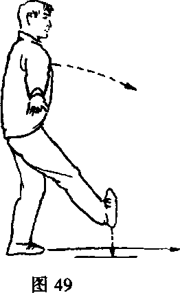 ②左脚落地,腿微屈膝,右脚同时用脚跟向前搓步,脚 离地,腿伸直,脚尖朝上。双掌随右脚搓步,臂内旋向下、向 后摆动至身体两侧,臂伸直,掌心朝下。目视前方(图49)。