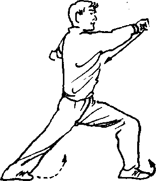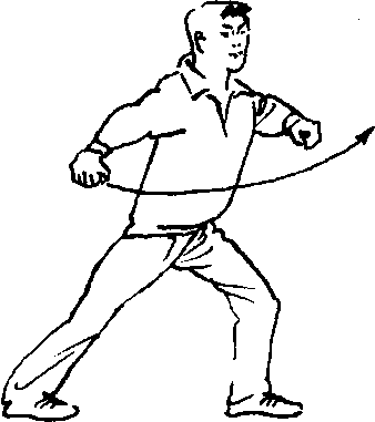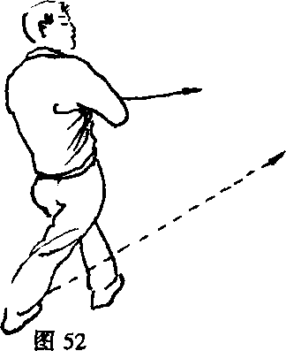 ①右脚震脚落地,左脚向前一步,左腿屈膝,右腿伸直, 上身微右转。双掌变拳,右拳向后摆至身右后方,拳心朝下; 左拳向右屈肘摆至身右前侧,拳心朝下。目视右前方(图 50) 0