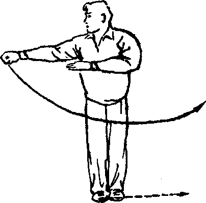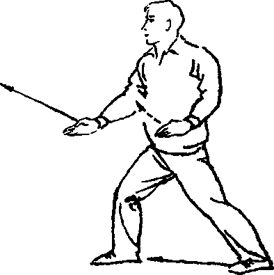 ①身起并左转,右脚向前一步落地,双掌随转身至身前 (图 43)。