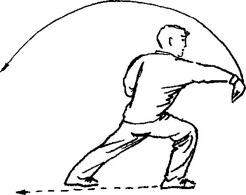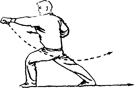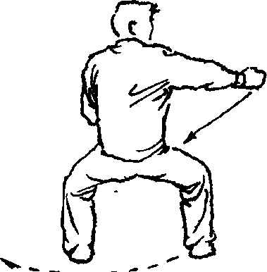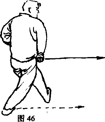 ②右脚从左脚后侧向后退一步,身体右转,双腿屈膝。右 拳随之后收腹前。目视前方(图46)。