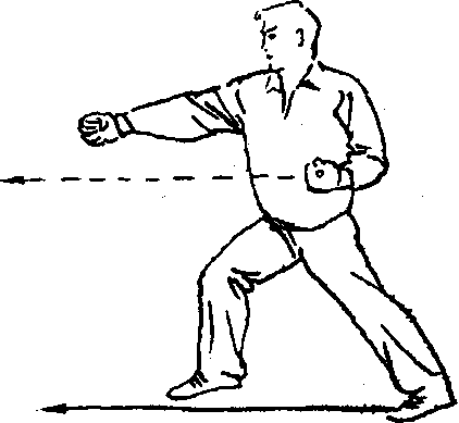②上动不停,左脚随即向前一步落地,双腿左屈右直成左 弓步。左拳随左腿向前直击,拳心朝下;右拳后拉至右腰间, 拳心朝上。目视左拳(图49)。