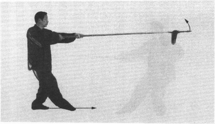 ③右手用力向前平推枪,臂伸直,左手向后滑握(简称: 中平扎枪)。同时,右脚向前迈一步,双腿屈膝,右脚尖着地, 成右虚步。目随枪尖。(图7)