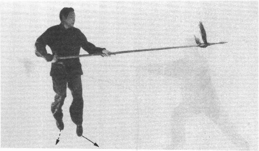 ②右脚向前提起,左脚蹬地跳起,身体腾空前跳。在空 中,双手握枪,做拿枪动作。目视枪尖。(图9)