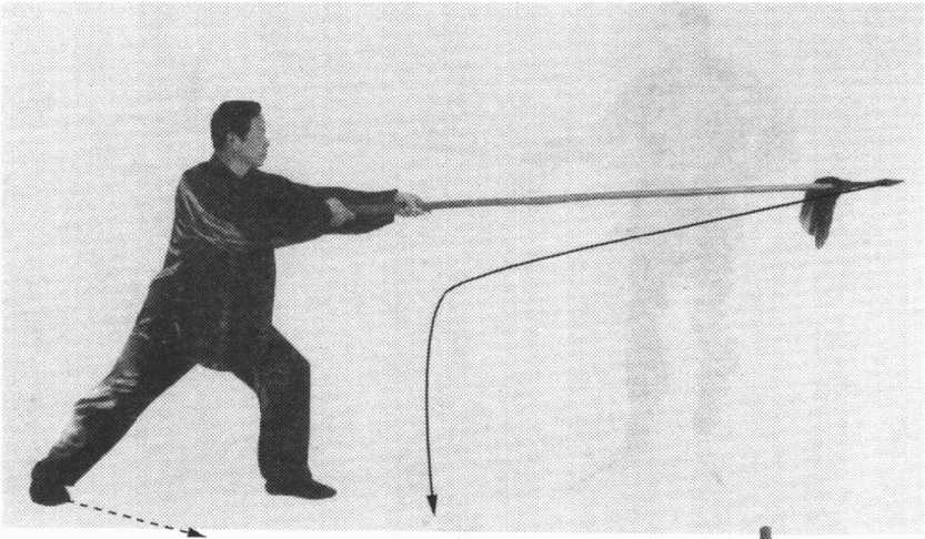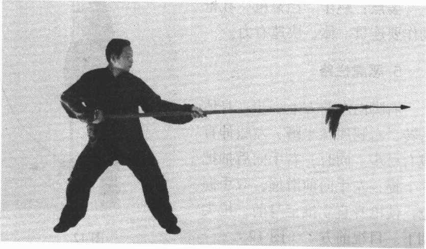 ④身体左转,左腿屈膝半蹲,右腿蹬直,成左弓步。与此 同时,右手用力向前中平扎枪;左手后滑握。目视枪尖。(图 11)