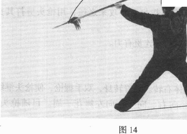 向前迈一步,身体左转,右腿屈膝半蹲,左腿伸直。双手握 枪,继续向左抡扫,当枪头扫至身体左方时,右手向右抽提 枪,左手向左滑握,使枪身横架于头上方,枪尖斜向左下,左 手心朝上,右手心朝前。目视前方。(图14)