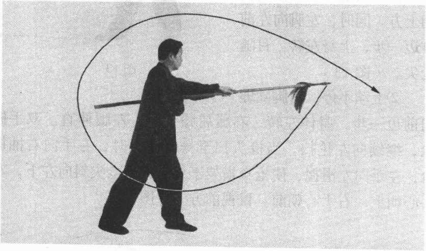 身体右转,左脚向前迈一步。同时,双手握枪,使枪头在 身体左侧向上、向前舞花半周。目视枪尖。(图15)