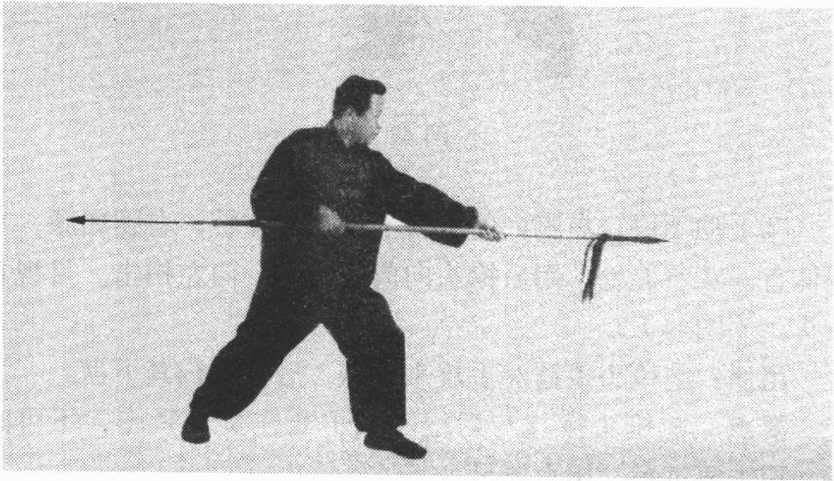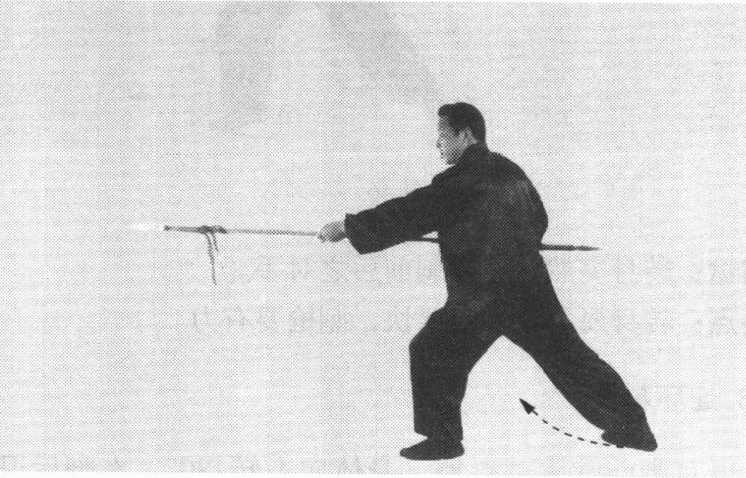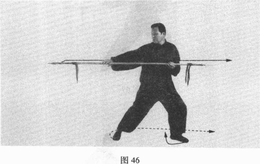 ②紧接着,双手握枪,用前枪头向前平刺。左腿屈膝,右 腿伸直。目视前枪尖。(图48)