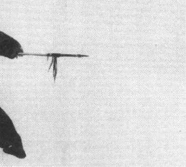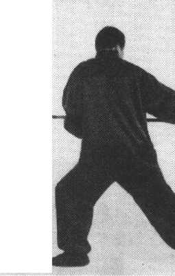 ①以双脚前掌为轴碾地,身体向右转180。,右脚后退一 步。双手握枪,随身转动,当右脚向后落步时,双手握枪,用 后枪尖向后平刺。目视后枪尖。(图47)