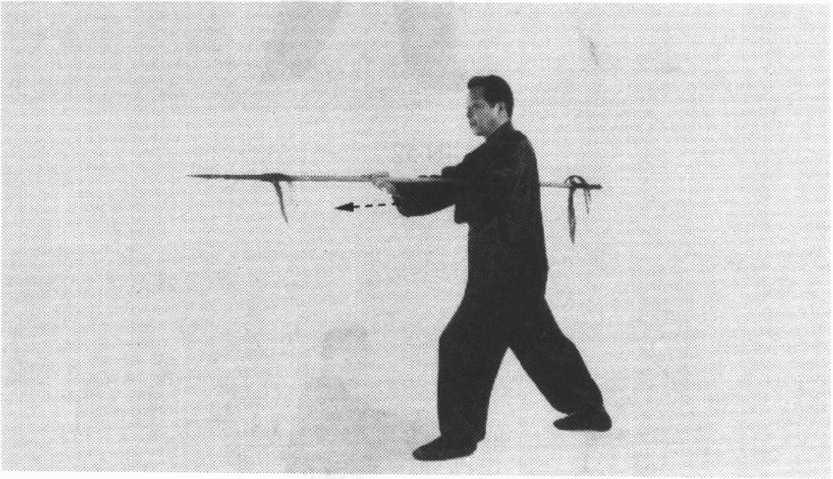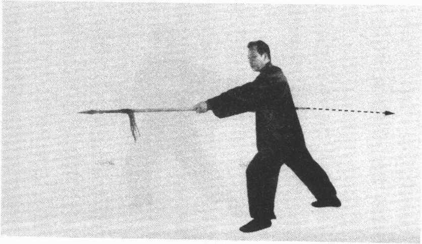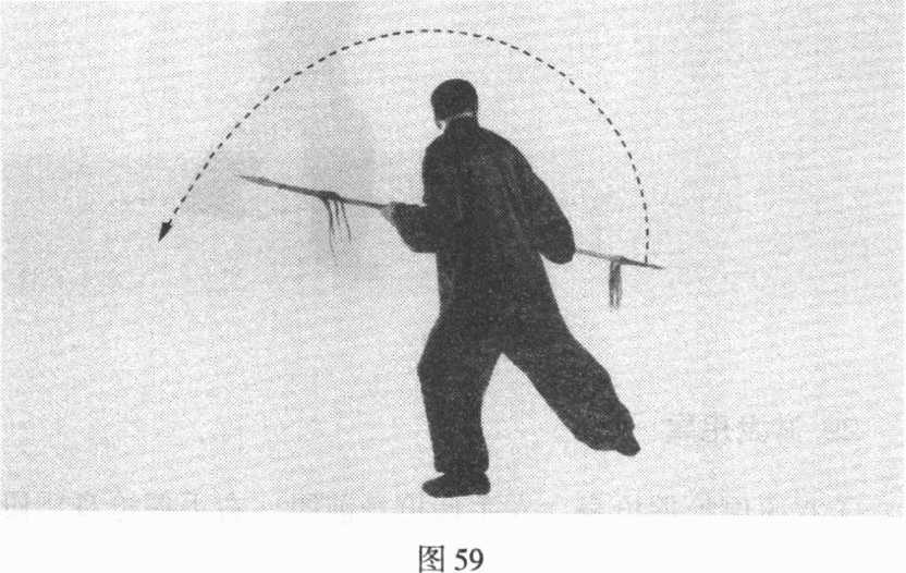 ⑤双手倒换握,右手握枪身前段,左手滑握枪身后段;随 即,右手后拉,左手后推,使前枪尖向后平刺。目视前枪尖。 (图 59)
