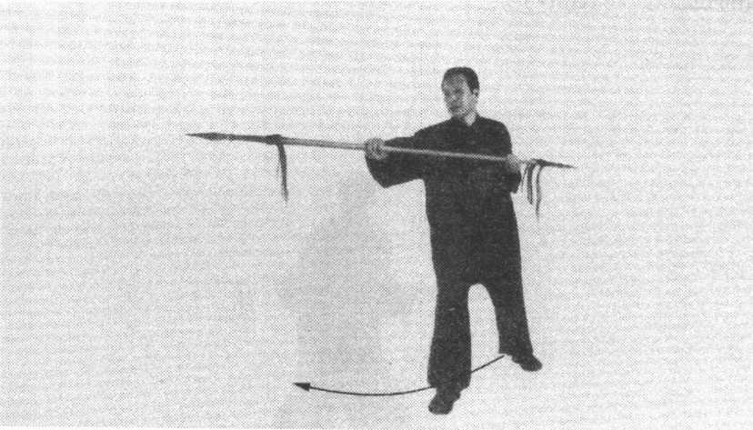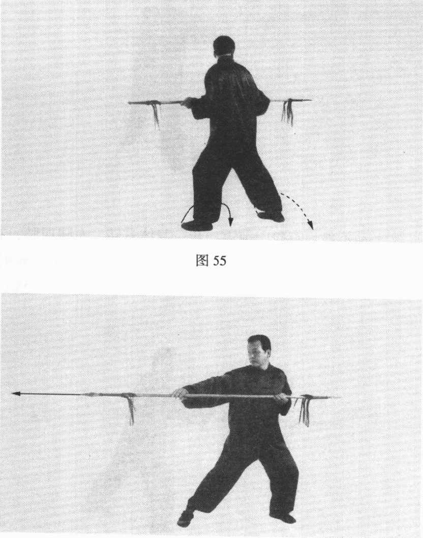 枪,用前枪头向右后平刺;转身后双脚落地时,双手倒换握枪 身,右手握枪身后段,并向右抽枪身,左手滑握枪身前段。目 视前枪头。(图56)