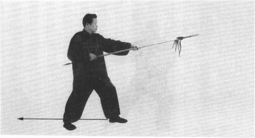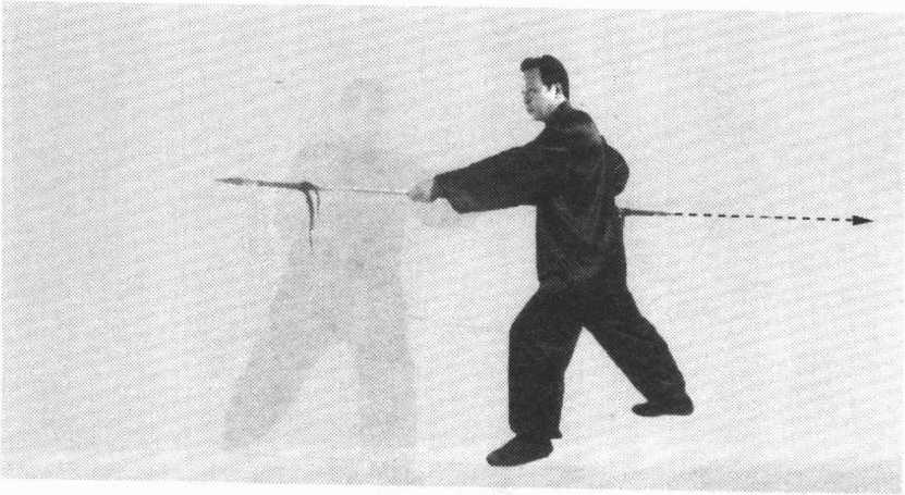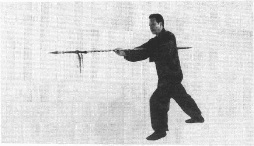 后转,左腿屈膝,右腿伸直。双手握枪,随转身用前枪尖向前 平刺,左手后滑握。目视前枪尖。(图62)