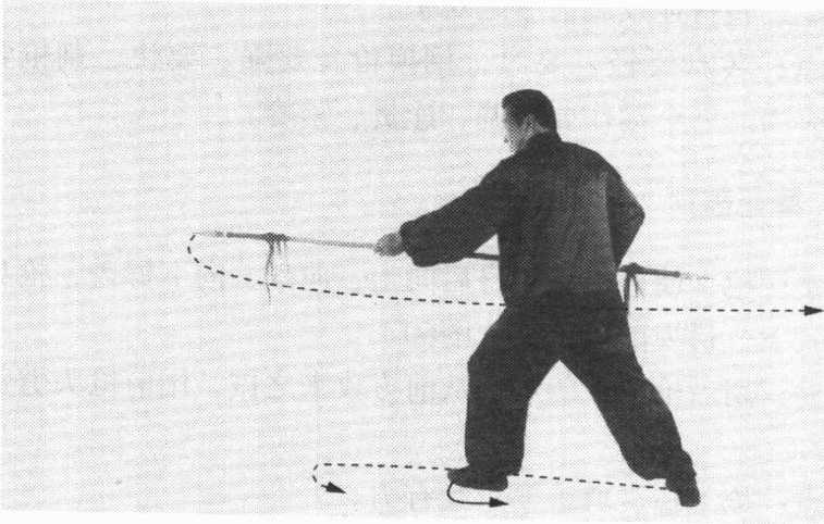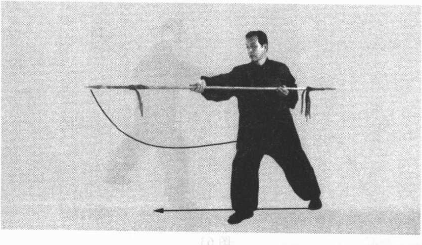 ④身体右转,右腿屈膝,左腿伸直。左手握枪身后段,随 转身用前枪尖用力向前推枪,右手后滑握。目视前枪尖。(图64)