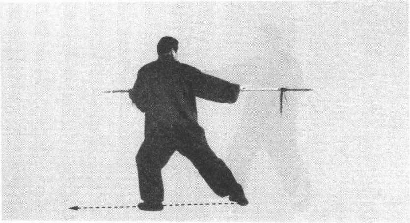 ③上动不停。身体左转,左脚向后退一步,左腿屈膝,右 腿伸直。随转身退步,左手握枪身后段,从身体左侧向后、向 左拉拽,右手滑握枪身前段后,用力向左推枪,双手拉推之合 力,使后枪尖向左平刺。目视后枪尖。(图63)