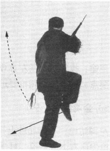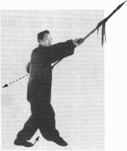 右腿站直,左脚从身 后屈膝上提身前,脚尖朝 下。在左脚上提的同时, 双手握枪,用前枪尖向身 体左下方刺枪;上身随之 左转。目视前枪尖。(图 70)