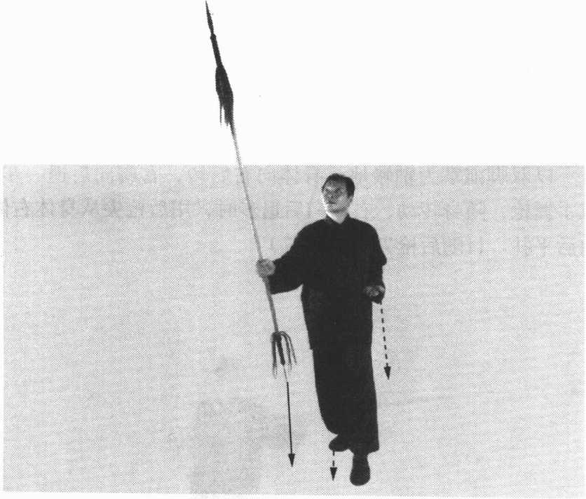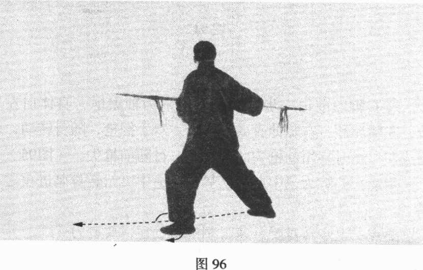 双手握枪,用后枪尖向身后平刺。双腿动作不变。目视后 枪尖。(图96)