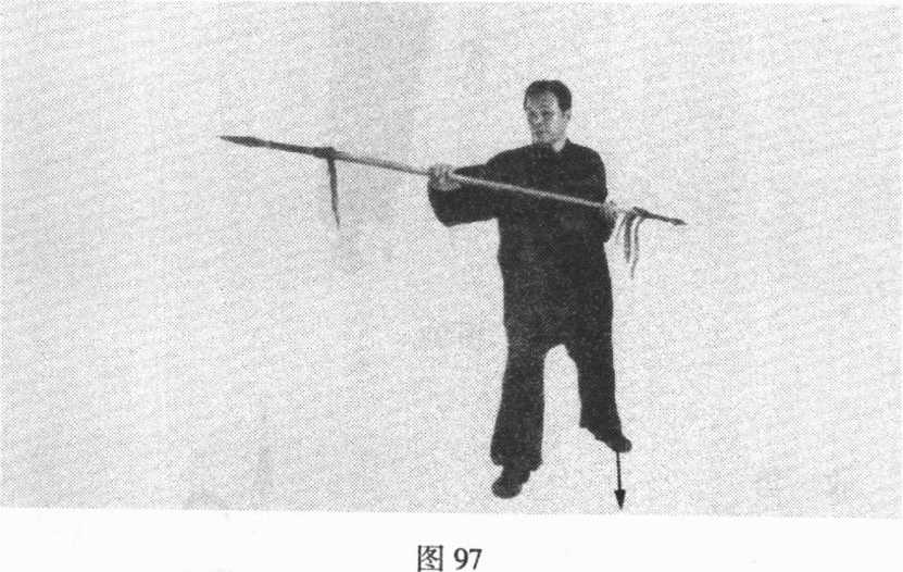 以双脚前掌为轴碾地,身体向右后转,右脚向后退一步。 双手握枪,随身转动,右脚向后退步时,用后枪尖从身体右侧 向后平扎。目随后枪尖。(图97)