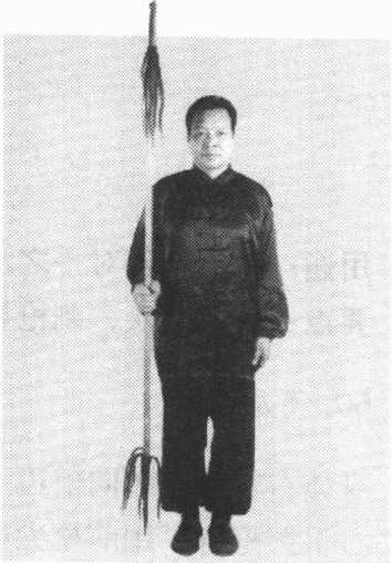左脚全脚掌落地站 稳,右脚向左脚靠拢并 齐。右手握枪身垂直下 落,后枪尖离地面约10 厘米,前枪尖朝上;左 掌直臂向下贴靠于左大 腿外侧。目视前方。 (图 99)