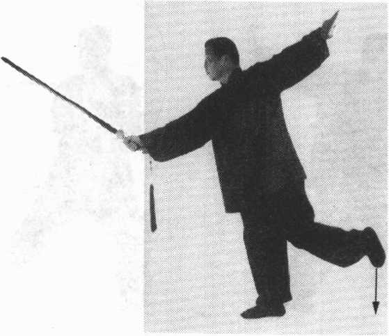右手持剑,先向前、向下点刺,后向上崩挑,剑尖斜朝前 上;左手剑指不变。右腿站稳,左脚向后翻蹶,脚离地,腿屈 膝,脚掌斜朝后上。目视剑尖。(图5)