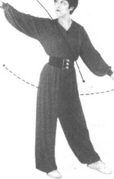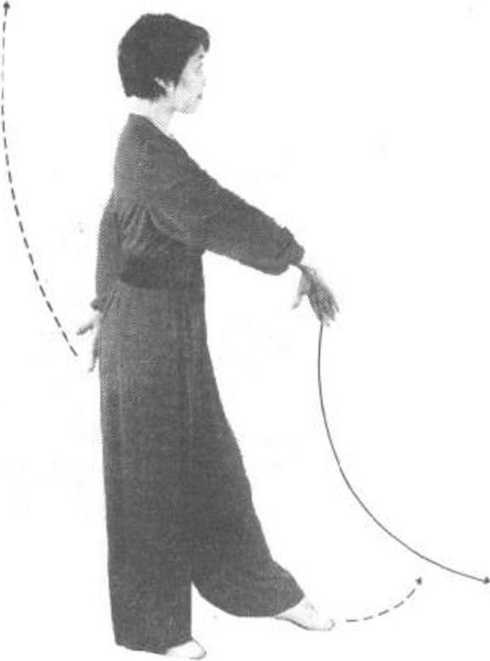 左脚向前上步,脚前掌着 地。右手向右后划弧摆至右上 后方,掌心向左,掌指斜向右上 方;左手向下划弧摆至左胯侧 方,掌心向下,指尖向左前。目 视右掌。【要求】上步划弧左、右手要协调,肩要放松,划弧要自 然,不可抬肘、耸肩。