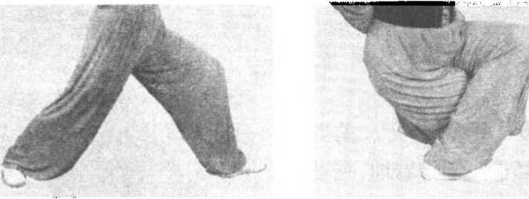 弓步 前腿屈膝前弓,膝部不超过脚尖,脚尖外展45度,全 脚掌着地;后腿自然伸直,脚尖微内扣,全脚或脚前掌着地。两 腿成一直线。(图三)歇步 两腿交叉,屈膝全蹲。前脚脚尖外展,全脚着地;后 脚脚跟离地,臀部坐于小腿接近脚跟处。(图四)(图三) (图四)