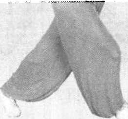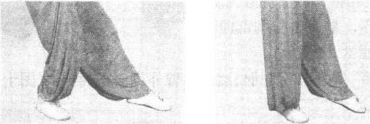 叉步两腿交叉。前脚脚 尖外展45度,全脚着地,屈膝半 蹲;后脚前脚掌着地,腿自然伸 直。(图九)