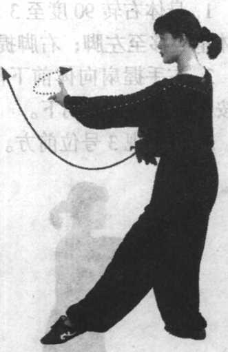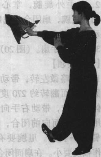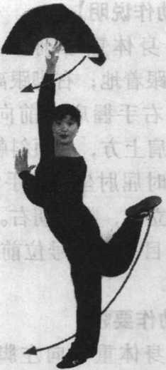 3 .独立开扇时左腿蹬直,身体向上拔高,右手向前开扇时, 要有向上的力,上体稍微向左转,但不能向前倾斜。