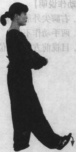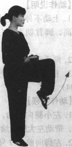 L身体重心置于右脚,右腿 伸直,身体上升,立腰提胯,带 动左腿屈膝提起。身体上升和左 腿提起应同时进行,动作应缓慢。