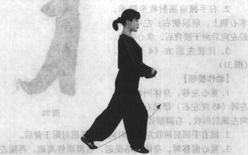 3 .重心前移时,身体先略提起,右脚顺势离地,再随左腿 屈膝,身体下沉。
