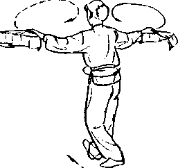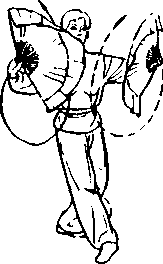 图 5-4 8b图 5-4 8b握扇从两侧展开同肩高; 手心向上,重心向前,右脚L 内扣(图5-48b)。