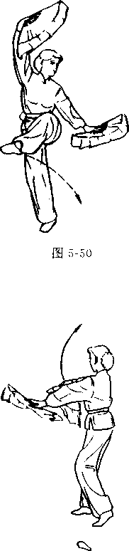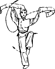 接上武,两手握扇随重心 前移向内向下,至两胯旁手心 向下;然后向内向上托扇提至 头上方,扇顶向前;同时抬起左 脚,脚心护住右膝盖(图5-49)。