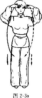 ①两手渐向上提至与额同高,同 时转掌心向里,指尖相对,眼随双手移 动(图2-3a)
