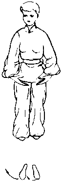 ③随右转腰,右脚向右45°方向 落步,左脚为实,右脚为虚;两手在腹 前交叉.右手在外,左手在里,目视前 方(图 2-4c) o