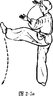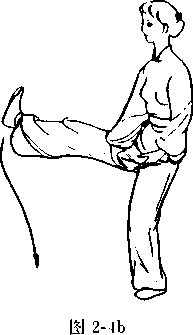 ②右脚微提离地面,随左转 腰带向左脚左侧,然后随右转腰 向前蹬脚,目视前方(图2-4b)o
