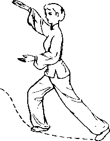 ?随重心前移,渐成右 弓步;同时腰微右转,左手向 左同肩高,右手向右上方拉开 成抱大球状,目视左前方(图