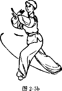 ② 随右转腰,右脚向右45° 方向落步成右弓步,目视右前 方(图 2-6b)o