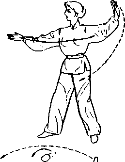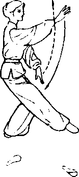 ②身体后坐,重心在右脚;左手 略上提至与肩平,右手向下、向体前 仰面顺时针划弧至右胯旁,目视前方 (S 2-15b)o