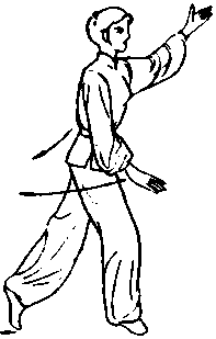 ②随重心向前移至右脚,左 手由右臂内侧向左上方穿出,掌心 向上虎,口向前;同时右手下拉至右 后下侧掌根向后,目视左前方(图