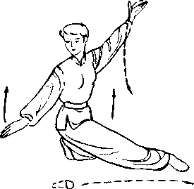 要点:右手翻掌上提、右脚 上步、起身、左手下拉推掌四动 作同时进行。